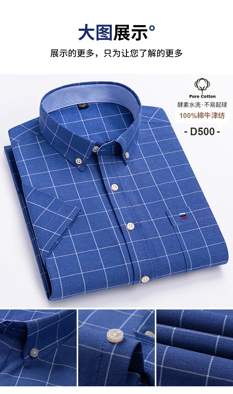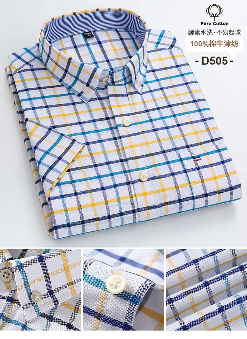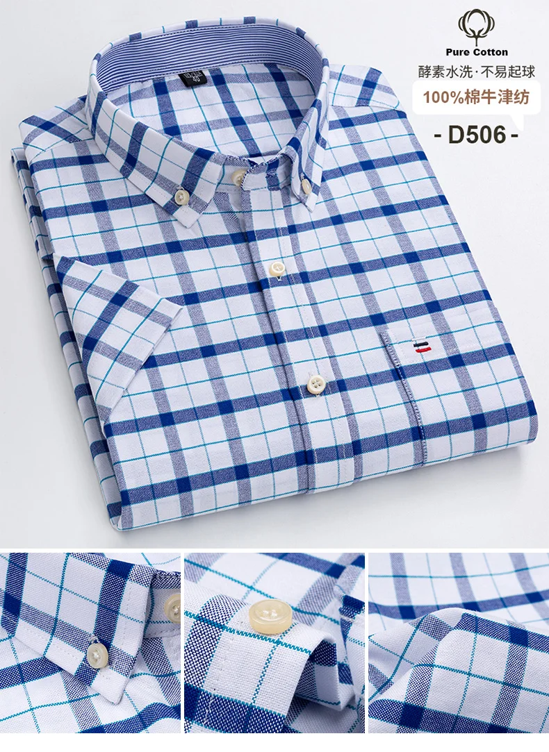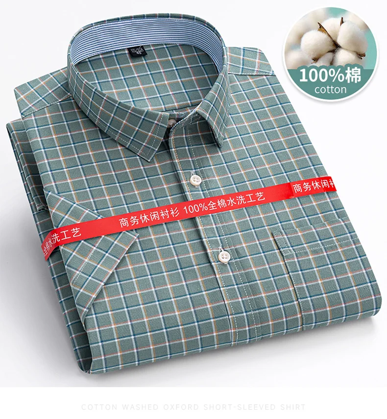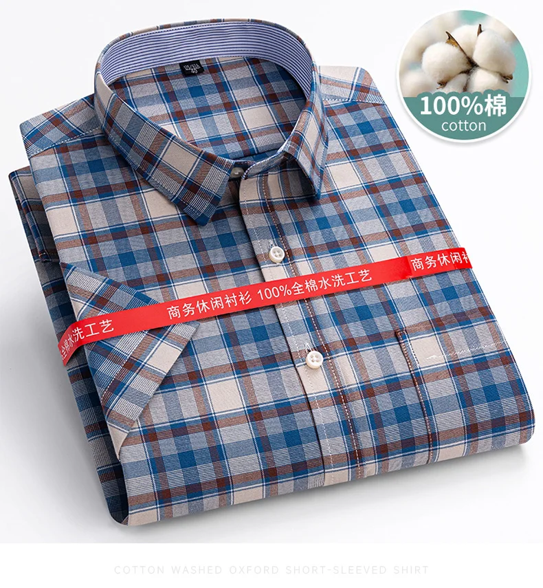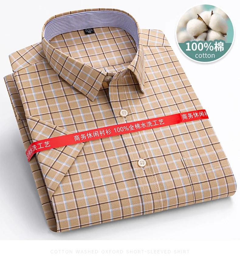 100%Pure Cotton Oxford Men’s Shirts Short Sleeve Plaid Soft Regular Fit Formal Dress Shirt Social Blouse Male Clothes 6XL 7XL