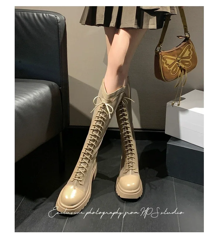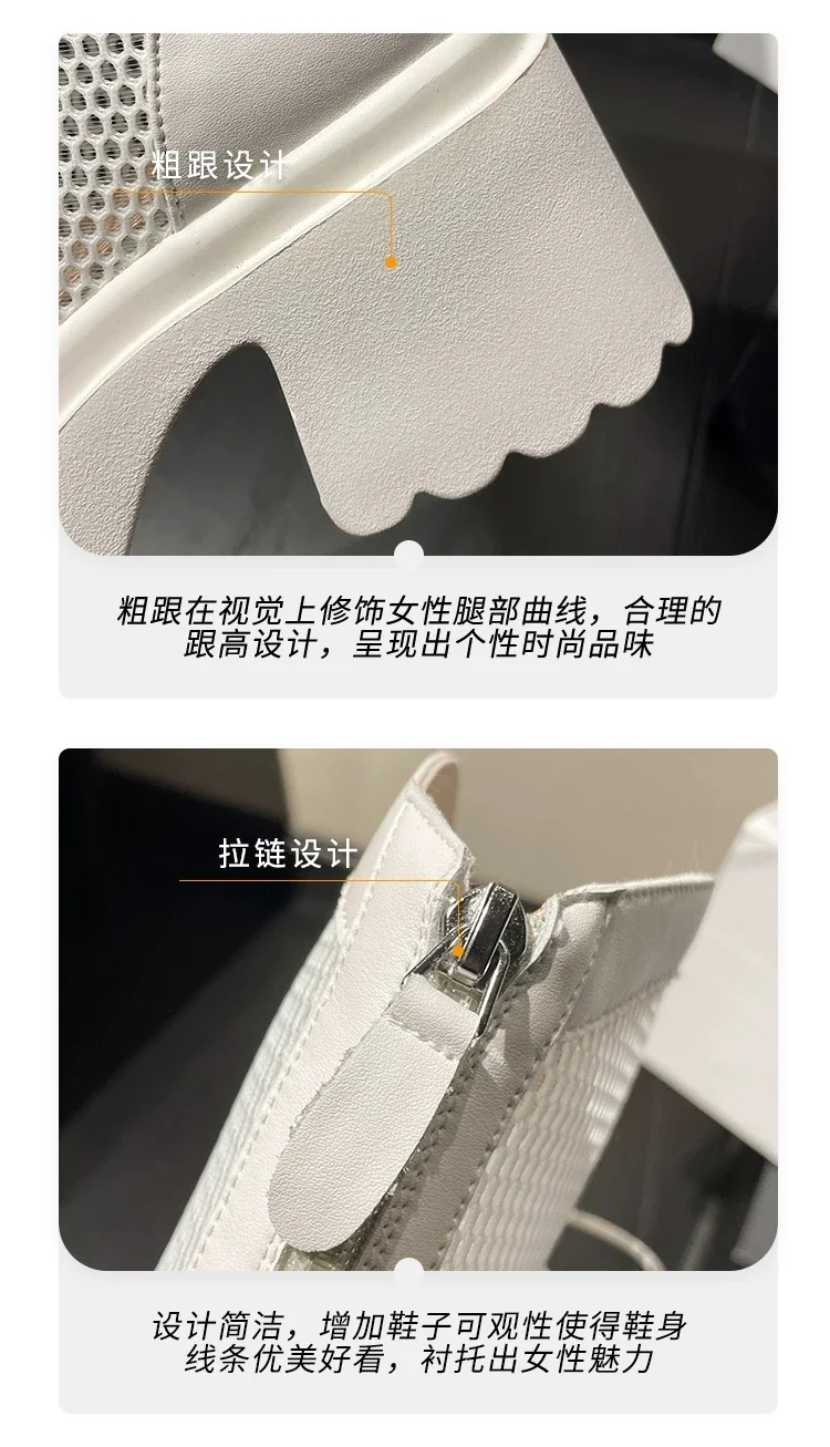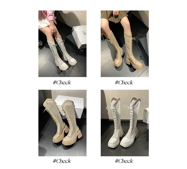 2024 Summer Hot Selling Solid Color Round Toe Square Heel Mesh Lace Up Breathable Back Zipper Women’s High Sandals Boots