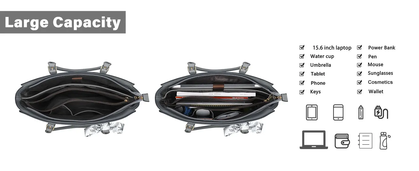 Roomy enough with 3 compartments for all your daily stuff. The computer compartment in the middle provides a thick padded foam section with a hook & loop strap closure for your laptop or tablet. Professional design to protect your laptop against accidental impacts and scratches. The other two side compartments & matching color small pouch case can store your jewelry, mobile phone, keys, mouse, passports, credit cards, cash, makeups and so on.