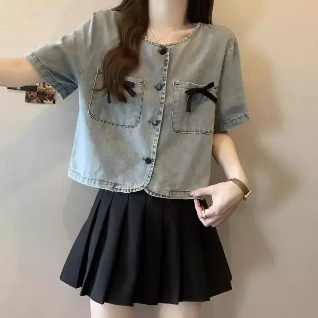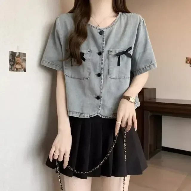 New Style for Women’s French Bow Short-sleeved Denim Shirt Fashionable Trendy Design Short Top