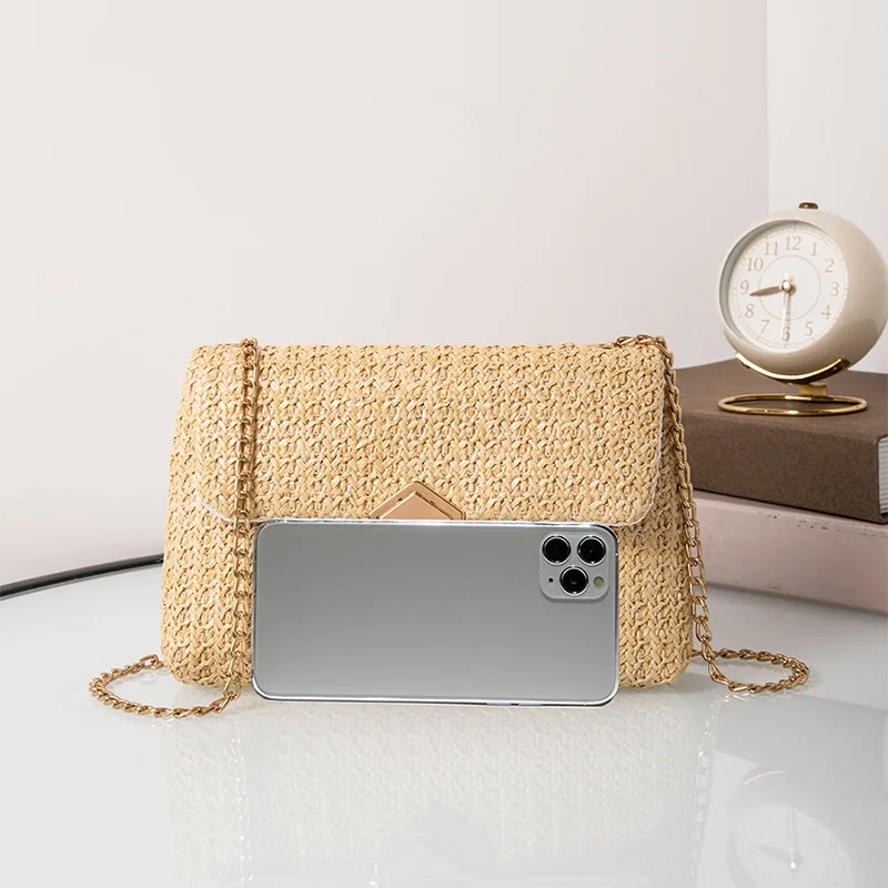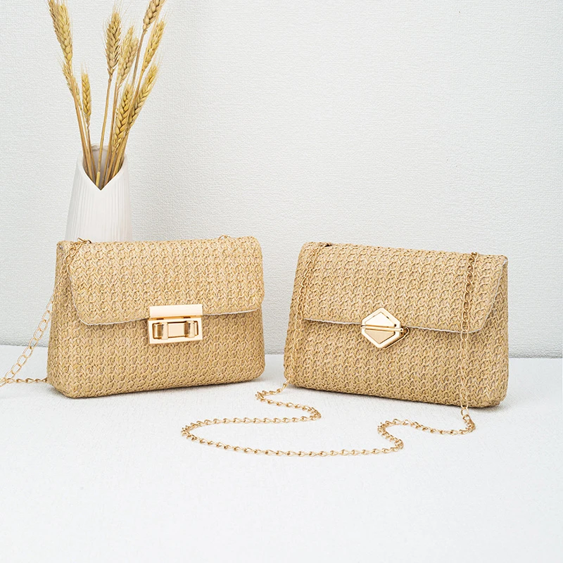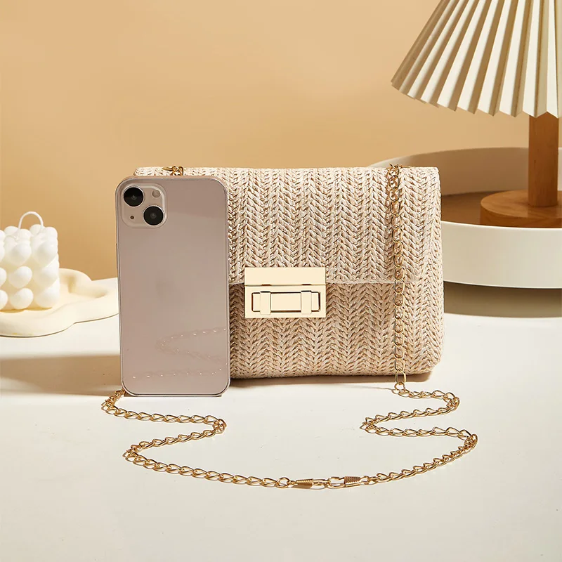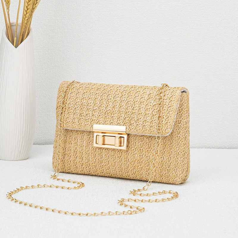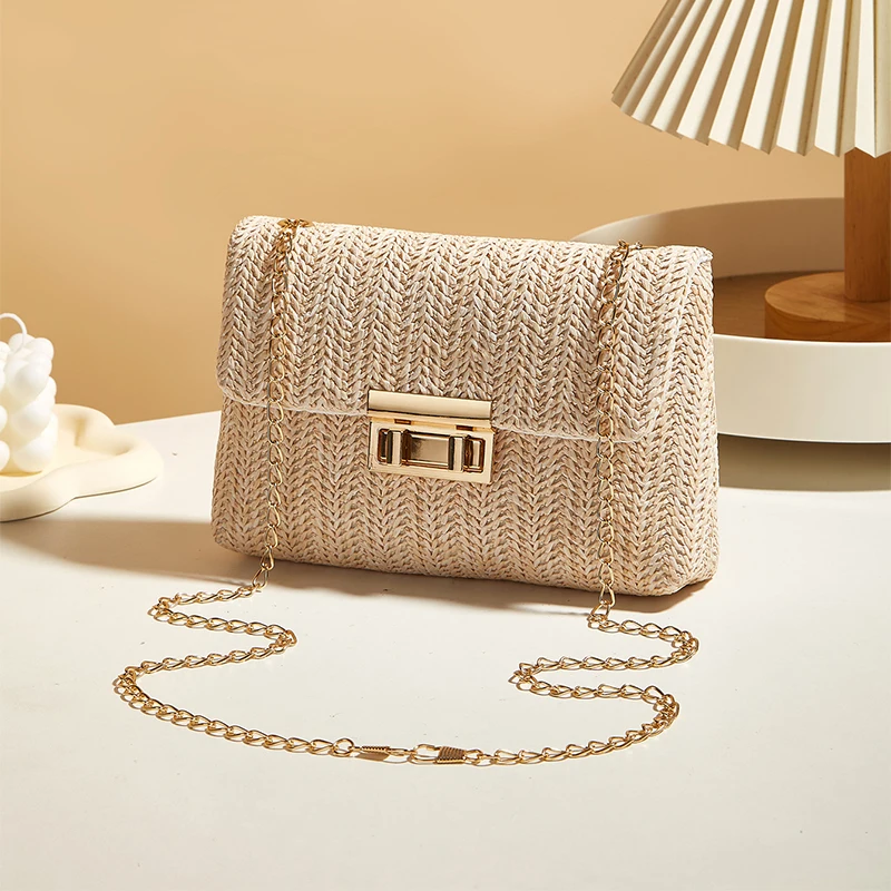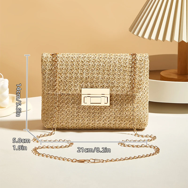 Straw Hand-woven Women’s Shoulder Bag Fashionable Solid Color Lock Woven Crossbody Bag Simple Versatile Chain Small Square Bag