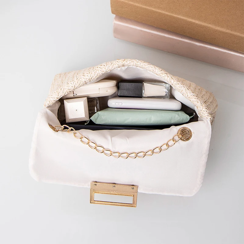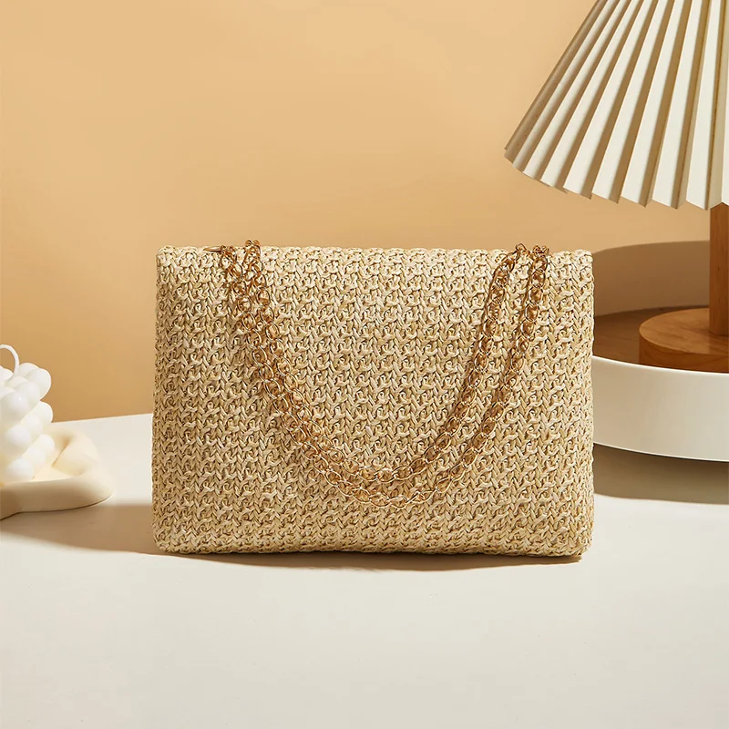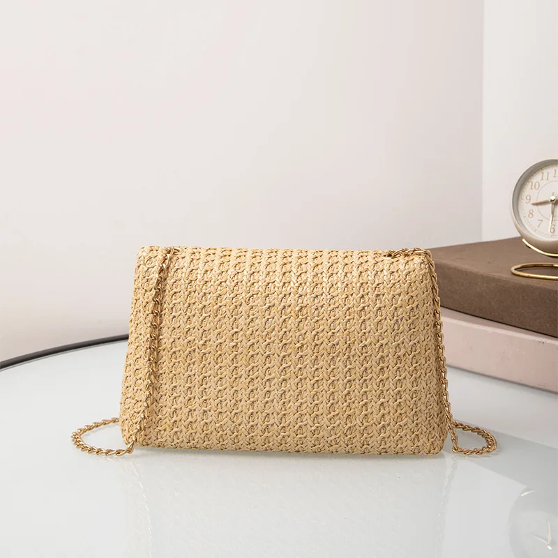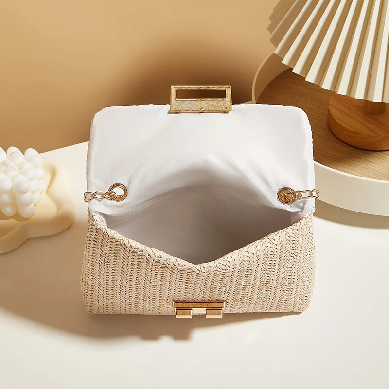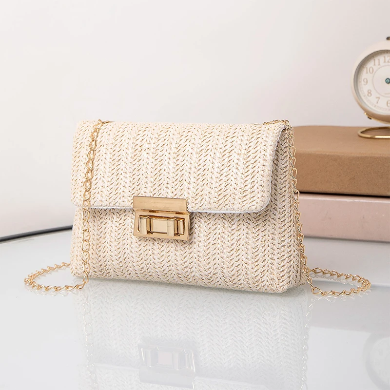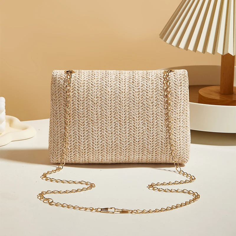 Straw Hand-woven Women’s Shoulder Bag Fashionable Solid Color Lock Woven Crossbody Bag Simple Versatile Chain Small Square Bag